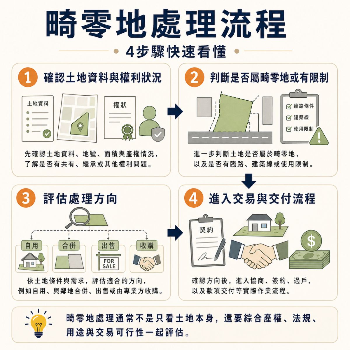 畸零地處理最怕一開始方向錯誤。例如,在還沒確認土地資料前,就急著問價格;在還沒確認使用分區前,就判斷能不能蓋;在還沒釐清產權前,就開始和買方談交易。這些情況都可能讓流程變得更複雜。