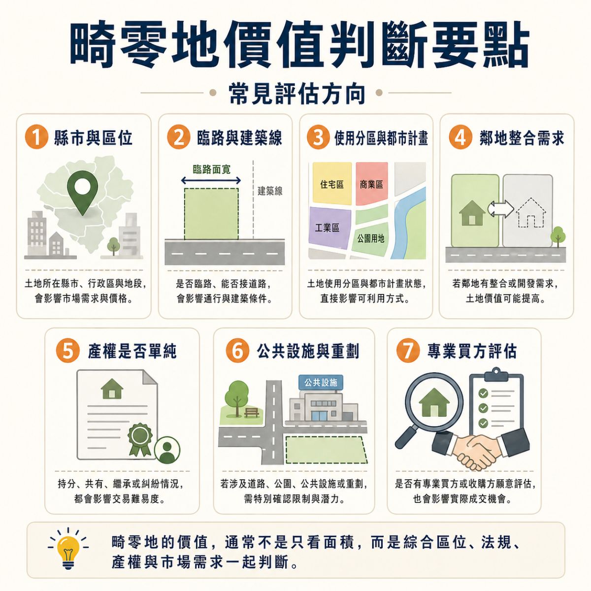 畸零地不是一定沒有價值,也不是一定不能處理。真正重要的是先釐清土地條件,包括土地是否符合建築基地規定、是否有鄰地整合可能、是否涉及公共設施或道路用地、產權是否單純,以及市場上是否有合適買方或收購方。